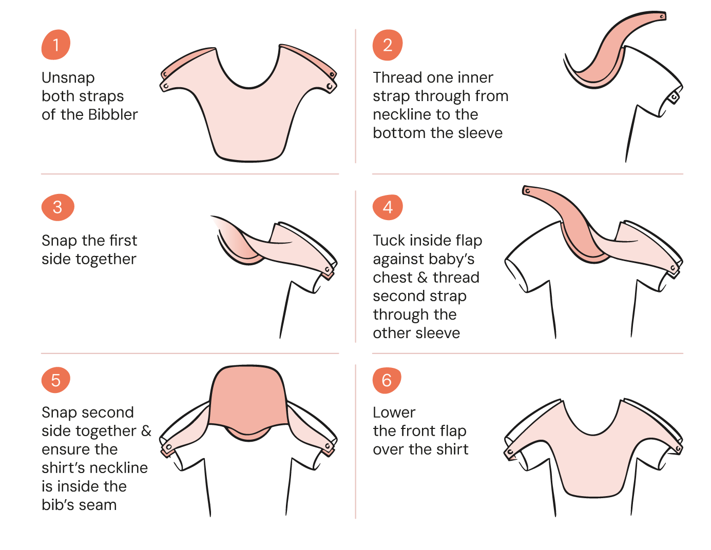 Instead of fastening around the neck, the Bibbler fastens to your baby's shirt, through the sleeves. This is how it works and how to wear one: